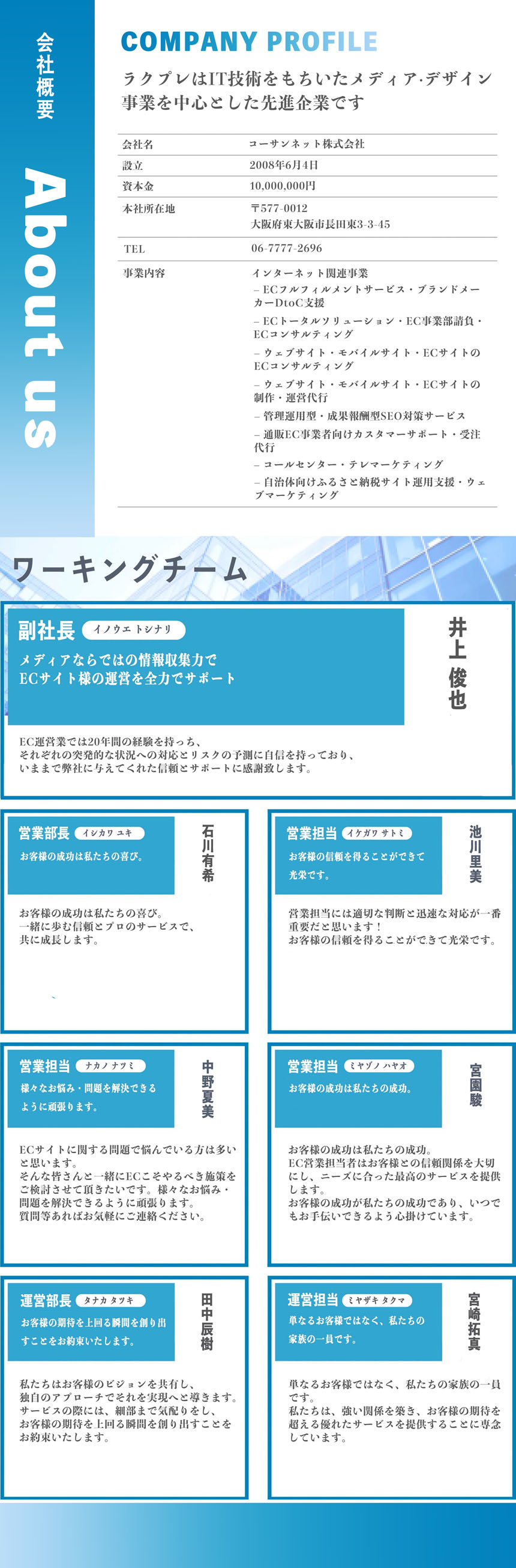 | 事業内容 | インターネット関連事業 – ECフルフィルメントサービス・ブランドメーカーDtoC支援 – ECトータルソリューション・EC事業部請負・ECコンサルティング – ウェブサイト・モバイルサイト・ECサイトの制作・運営代行 – 管理運用型・成果報酬型SEO対策サービス – 通販EC事業者向けカスタマーサポート・受注代行 – コールセンター・テレマーケティング – 自治体向けふるさと納税サイト運用支援・ウェブマーケティング |